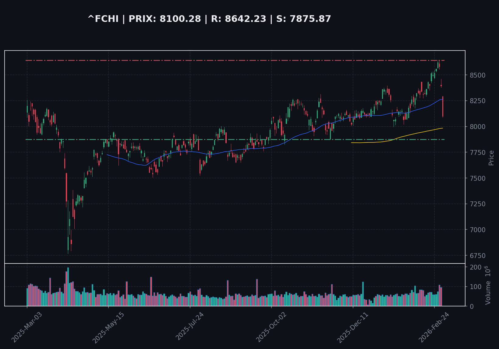 Verdict : BAISSIER. Notre précédent verdict "HAUSSIER" est invalidé. Le changement de régime est brutal et dicté par un facteur exogène puissant. La structure technique qui soutenait notre thèse haussière a été rompue par la vague de ventes. La convergence entre le flux de nouvelles anxiogènes et la violence de la baisse confirme la pression vendeuse. La priorité est désormais à la gestion du risque. Nous surveillons la zone de la moyenne mobile à 200 jours (7983 pts) comme un niveau potentiel de stabilisation ou de capitulation. Une rupture de ce seuil signalerait l'entrée dans une phase de correction plus profonde.