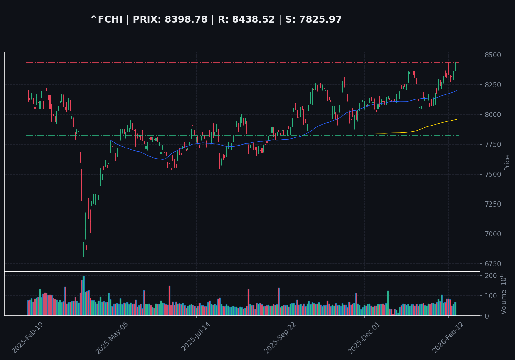 Le CAC 40 clôture à 8398.78, avec un RSI(14) de 64.93 indiquant une pression acheteuse. Le cours se situe bien au-dessus de sa SMA(200) à 7959.71, confirmant une tendance haussière à long terme. * Résistance 30J : 8438.52 * Support 30J : 7996.59