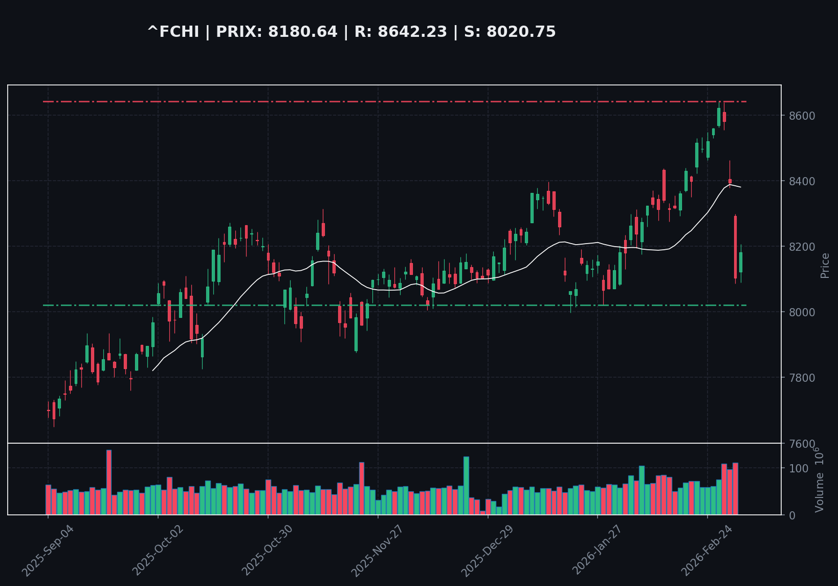 La séquence des prix révèle une rupture de momentum significative. La séance d'hier a été marquée par une forte distribution institutionnelle, avec une baisse de -2.27% sur des volumes élevés (111M), confirmant une pression vendeuse agressive. L'indice a ainsi cassé son support court terme, la moyenne mobile à 20 jours (SMA20) située à 8380€. La séance actuelle montre un rebond de +0.73%, mais sur une base volumétrique extrêmement faible, ce qui le qualifie de rebond purement technique et non d'une reprise de la demande. Le RSI à 42.31 confirme que le momentum est baissier. Le prochain niveau de support majeur se situe à 8020.75€.