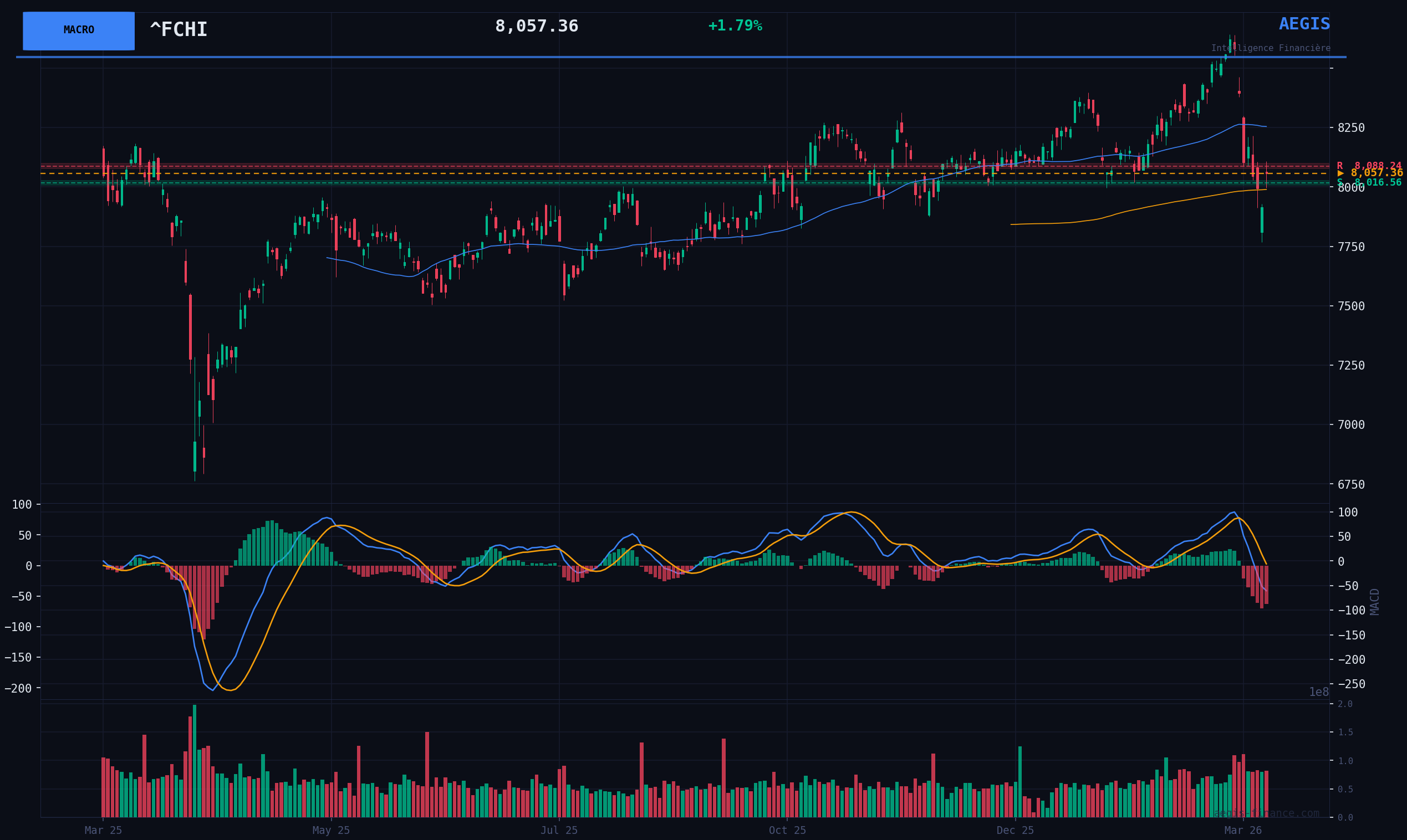 BEARISH Scenario (Probability: 50%): A confirmed break of the SMA200 support (~7990 points), catalyzed by a geopolitical escalation or a restrictive speech from central banks, would lead to a BEARISH acceleration towards the 30-day support at 7768 points. A VIX persisting above 25 would reinforce this scenario. Base Scenario (Probability: 40%): The index manages to defend the support zone of 7990-8000 points and enters a phase of lateral consolidation. The market digests the news without a clear direction, oscillating between the SMA200 support and the SMA20 resistance. Volatility remains high. BULLISH Scenario (Probability: 10%): A sudden easing of geopolitical tensions or an unexpected accommodating signal from the Fed could trigger a rebound. A clear recovery of the SMA20 at 8322 points would be necessary to invalidate the current BEARISH pressure. This scenario remains unlikely in the current context. 4. AEGIS VERDICT The verdict is BEARISH with moderate confidence. The confluence of signals (high VIX, technical dynamics below the SMA20, negative news flow) argues for a continuation of the correction. The defense of the key SMA200 support at 7990 points is the short-term pivot. A failure to maintain this level would signal a deeper degradation of the market structure. The strategy is to monitor a potential break of this support to confirm the BEARISH scenario.