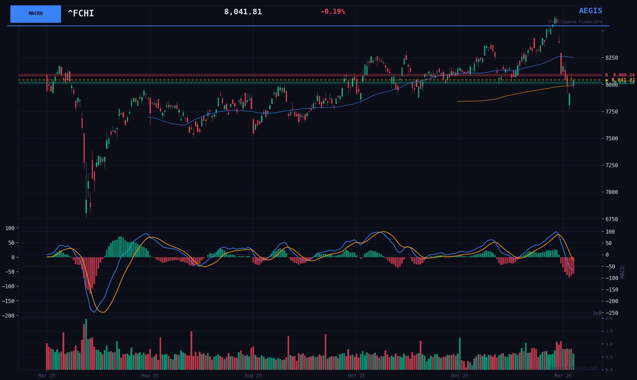 L'indice se trouve à un point d'inflexion technique crucial. Au prix actuel de 8041.81 points, il se maintient de justesse au-dessus de sa moyenne mobile à 200 jours (SMA200) située à 7990.97 points, qui constitue le dernier rempart de la tendance haussière de long terme. L'ouverture du jour s'est faite sous ce niveau, mais un rebond intraday est en cours. Le momentum à court terme reste néanmoins clairement baissier, comme l'indique la position du prix bien en dessous de la SMA20 (8308.52 points). Le RSI à 35.72 n'est pas encore en zone de survente extrême, suggérant qu'une poursuite de la pression vendeuse vers le support des 7768.11 points reste possible. Le volume, à 81% de la moyenne, n'indique pas de capitulation mais une participation active autour de ce niveau pivot.