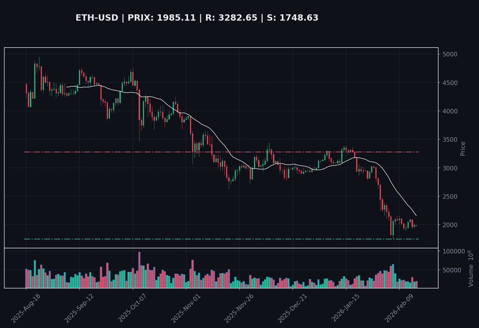 Ethereum (ETH-USD) se négocie à 1985.11, avec un RSI (14) de 34.46. Le support (bas de 30 jours) se situe à 1748.63, tandis que la résistance (haut de 30 jours) est à 3282.65. La SMA 200 (tendance longue) est à 3529.17. Le signal technique global est actuellement neutre. Si Ethereum casse la résistance à 3282.65, l'objectif suivant serait plus haut. Sinon, un retour vers le support à 1748.63 est possible.