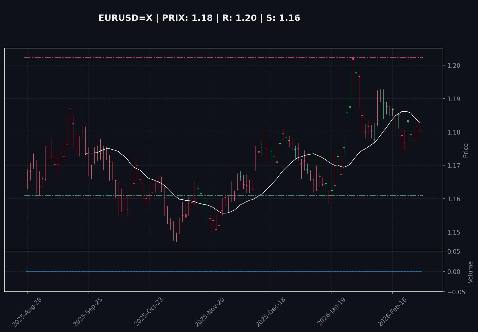 La séquence des prix sur les trois dernières sessions est une anomalie, affichant une variation nulle. Le cours est figé à 1.18 $, un niveau qui coïncide précisément avec sa moyenne mobile à 20 jours (SMA20), signalant un équilibre parfait à court terme. Le volume, à 100% de sa moyenne mensuelle, confirme cette absence de pression institutionnelle : les échanges se font sans biais directionnel. Le RSI à 47.11 corrobore ce manque de momentum. La structure est une contraction de volatilité extrême, bornée par le support à 1.16 $ et la résistance à 1.20 $. Le prix reste au-dessus de sa SMA200 (1.17 $), maintenant un fond structurel légèrement positif mais non activé.
