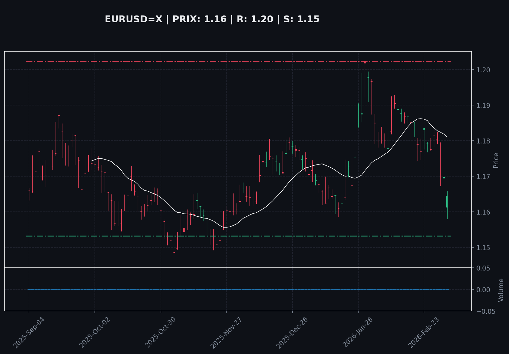 La séquence des prix sur les trois derniers jours (1.18$ -> 1.17$ -> 1.16$) confirme une dynamique baissière établie. Actuellement, la paire évolue sous ses moyennes mobiles clés à 20 jours (1.18$) et 200 jours (1.17$), signalant une structure de marché faible à court et long terme. Le RSI(14) à 24.05 est en territoire de survente, ce qui explique la légère reprise technique observée en intraday (+0.27%). Cependant, cette condition de survente, sans divergence de momentum, suggère davantage une pause ou une consolidation qu'un retournement de tendance. Le volume, à 100% de sa moyenne mensuelle, valide la pression vendeuse récente sans pour autant indiquer une capitulation imminente. Le prochain niveau structurel majeur se situe sur le support des 30 jours à 1.15$.