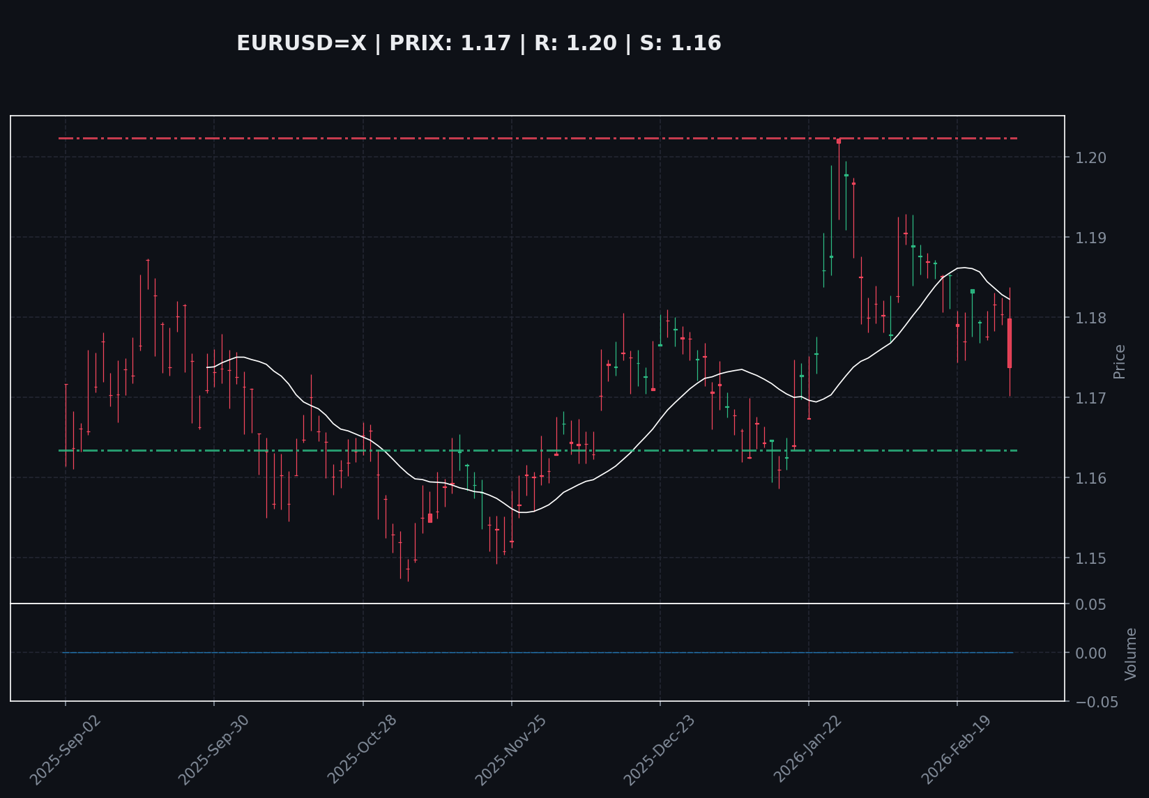 La paire EUR/USD affiche une nette pression vendeuse, matérialisée par la rupture du seuil de 1.18$, coïncidant avec sa moyenne mobile à 20 jours (SMA20). Le prix évolue désormais sur sa moyenne mobile long-terme (SMA200) à 1.17$, un pivot structurel majeur. Le RSI(14) à 28.14 confirme l'intensité du momentum baissier en entrant en zone de survente. Le volume, à 100% de sa moyenne, valide la pression actuelle sans pour autant signaler une capitulation. Les niveaux clés sont un support à 1.16$ et une résistance à 1.20$.