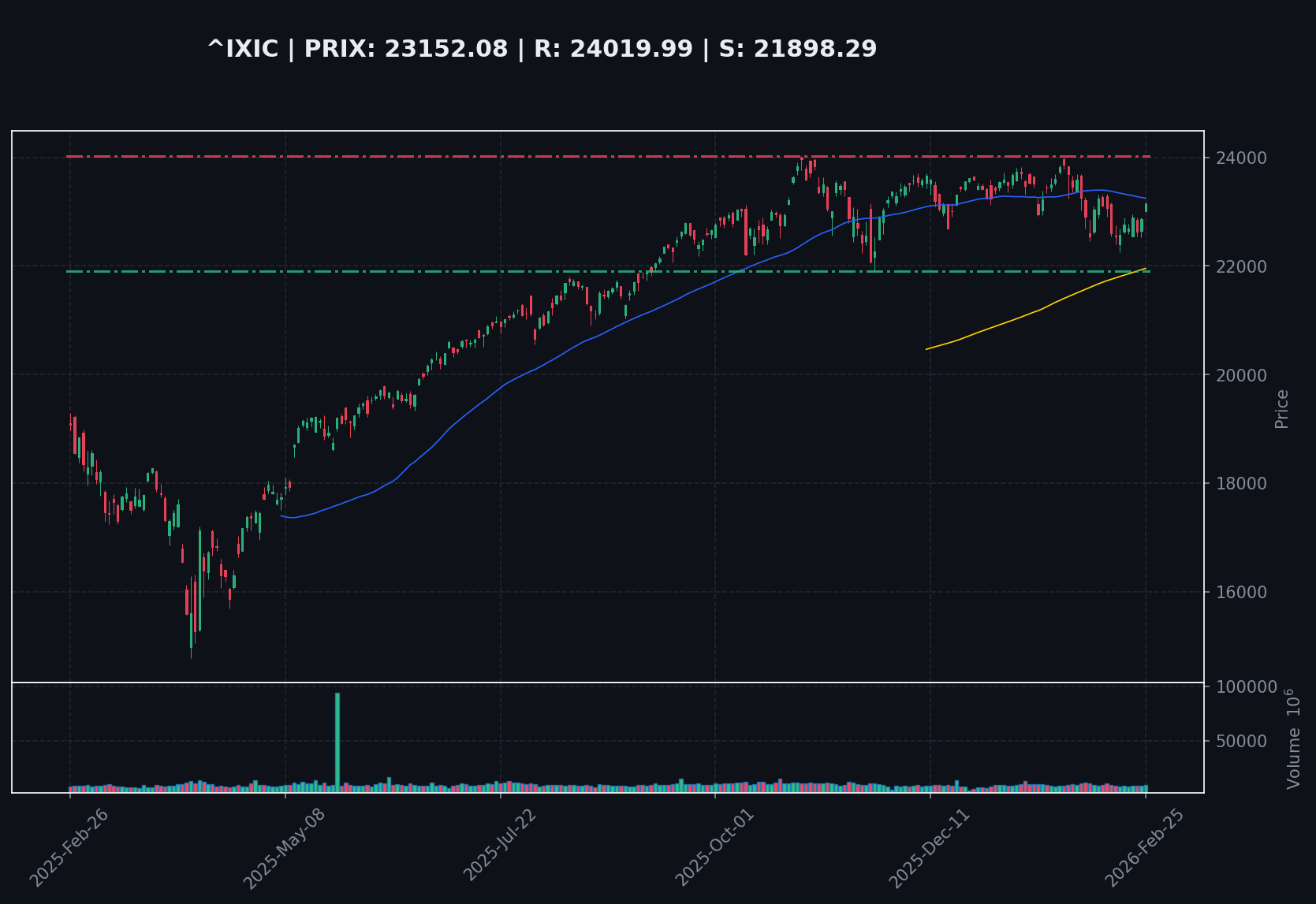 L'indice RSI(14) se situe à 52.07, indiquant une situation neutre. Le prix actuel est au-dessus de la SMA(200) qui est à 21955.03, signalant une tendance potentiellement haussière à long terme. Les niveaux de support et de résistance à surveiller dans les 30 prochains jours sont respectivement 22256.76 et 23988.27.