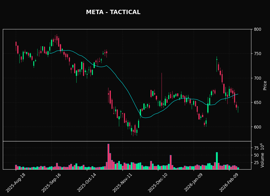 Méta se négocie actuellement à 639.83, en dessous de sa SMA 200 (688.55), ce qui suggère une tendance de fond légèrement baissière. Le RSI à 42.76 confirme l'absence de momentum fort dans un sens ou dans l'autre.