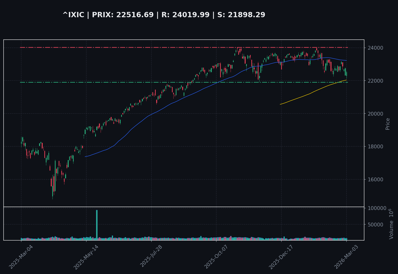 Verdict : NEUTRE. Le Nasdaq Composite est en phase de digestion et d'indécision. La tentative de rebond intraday manque de conviction volumétrique et ne parvient pas à effacer le gap baissier initial. L'indice est techniquement piégé entre son support majeur à 22124.78$ et la résistance de la SMA20. Une rupture confirmée du support signalerait une capitulation et une nouvelle jambe de baisse. À l'inverse, la reconquête de la SMA20 est nécessaire pour stabiliser la structure technique.