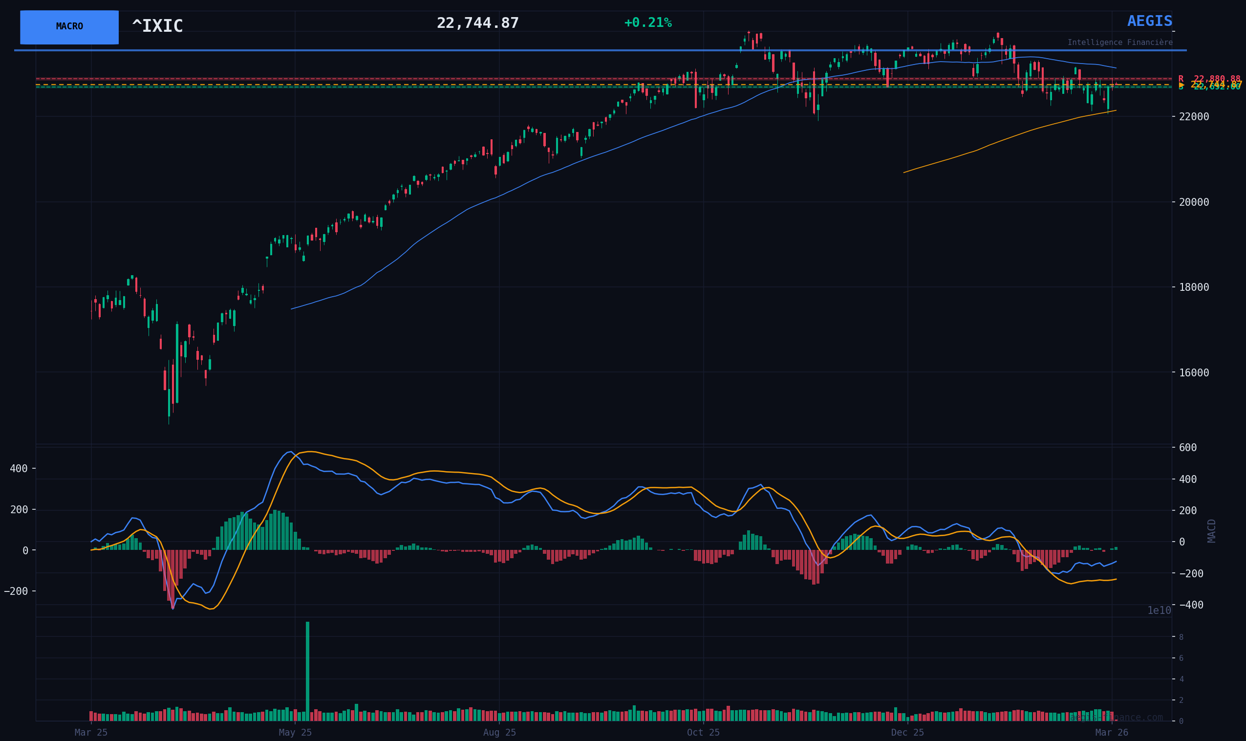 2. TECHNICAL DYNAMICS The Nasdaq Composite index is evolving in a clear consolidation phase after a strong BULLISH impulse two sessions ago (+2.31%). The price oscillates around its 20-day moving average (22732 pts), acting as an immediate technical pivot. The RSI(14) at 51.17 confirms this neutrality. The most notable element is the extreme compression of volume, at only 14% of its average, which signals a marked institutional indecision and an absence of selling pressure. The underlying trend remains BULLISH, with the index remaining comfortably above its 200-day moving average (22143 pts).