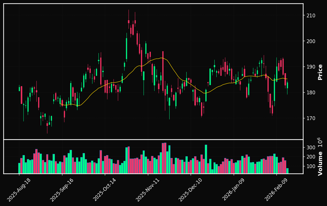 Le RSI à 58.56 suggère une force sous-jacente saine pour NVDA, laissant de la marge pour une potentielle appréciation supplémentaire avant d'atteindre des niveaux de surachat. Le cours de 182.81 se maintient bien, illustrant la résilience du titre face aux mouvements de marché.
