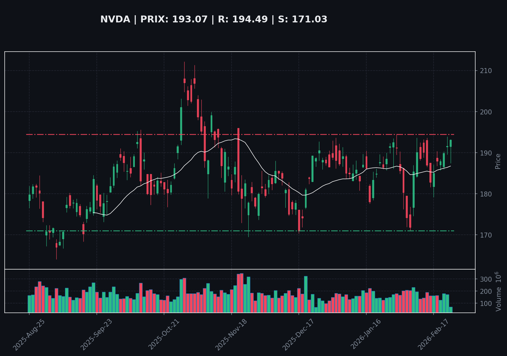 Nvidia se situe à 193.16, avec un RSI(14) à 58.48, indiquant une dynamique neutre. Le SMA(200) se trouve à 173.94. La résistance à court terme est à 194.49 et le support est à 171.03. Si Nvidia franchit la résistance à 194.49, l'objectif suivant serait une poursuite de la hausse. Si Nvidia ne parvient pas à franchir la résistance, un retour vers le support à 171.03 est probable.