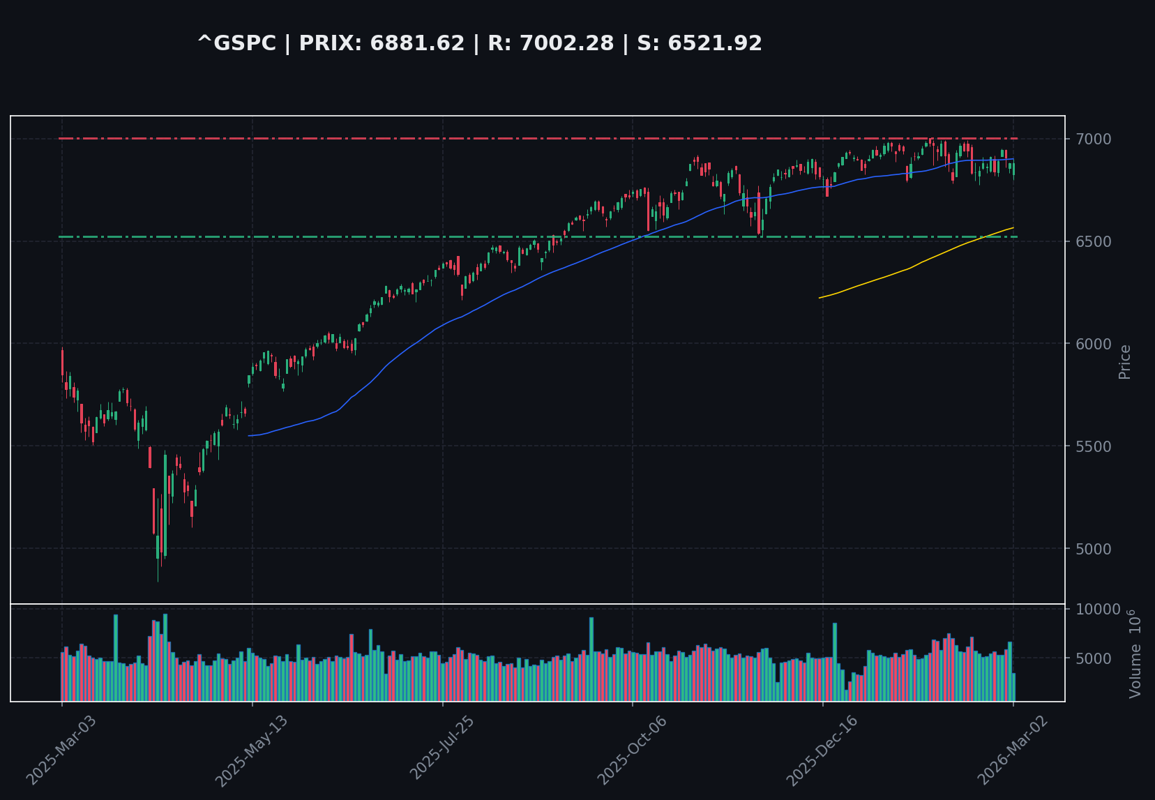 La séance du jour a été marquée par un gap baissier à l'ouverture, enfonçant le support de la moyenne mobile à 20 jours (SMA20) située à 6893.20$. Cet événement constitue une dégradation technique à court terme. Bien qu'un rebond intraday ait permis de revenir au contact de cette moyenne, la pression volumétrique reste très faible (59% de la moyenne), ce qui questionne la solidité de cette reprise. Un échec à reconquérir et clôturer au-dessus de la SMA20 confirmerait le passage en territoire baissier à court terme, avec le support des 30 jours à 6775.50$ comme prochaine cible. Le RSI à 41.64 indique une perte de momentum sans pour autant signaler une condition de survente.