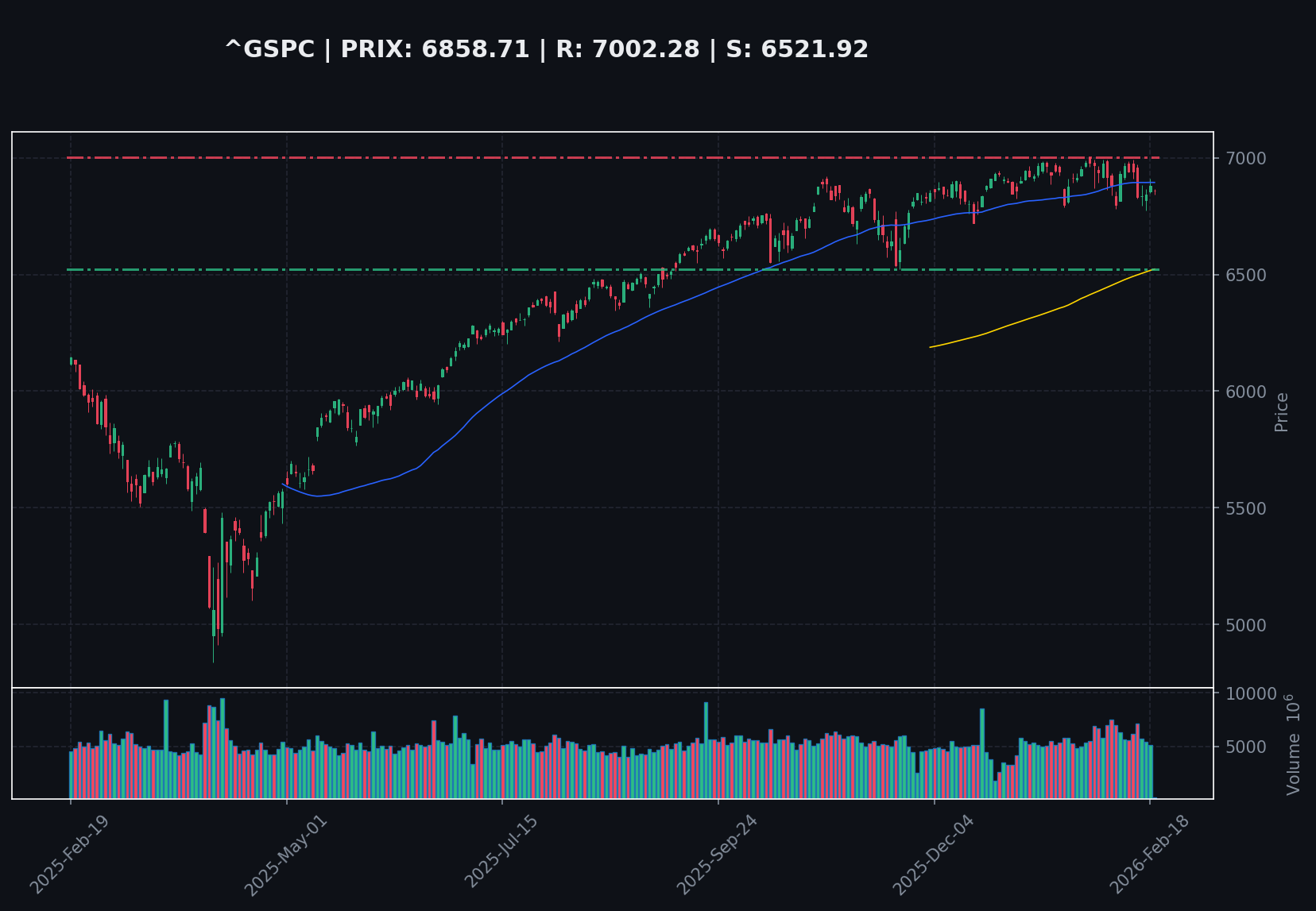 Le S&P 500 se situe actuellement à 6858.27, avec un RSI(14) neutre à 46.12. Le support 30 jours est à 6775.50, tandis que la résistance 30 jours est à 7002.28. L'indice est bien au-dessus de sa moyenne mobile sur 200 jours (6523.34), ce qui suggère une tendance haussière de long terme.