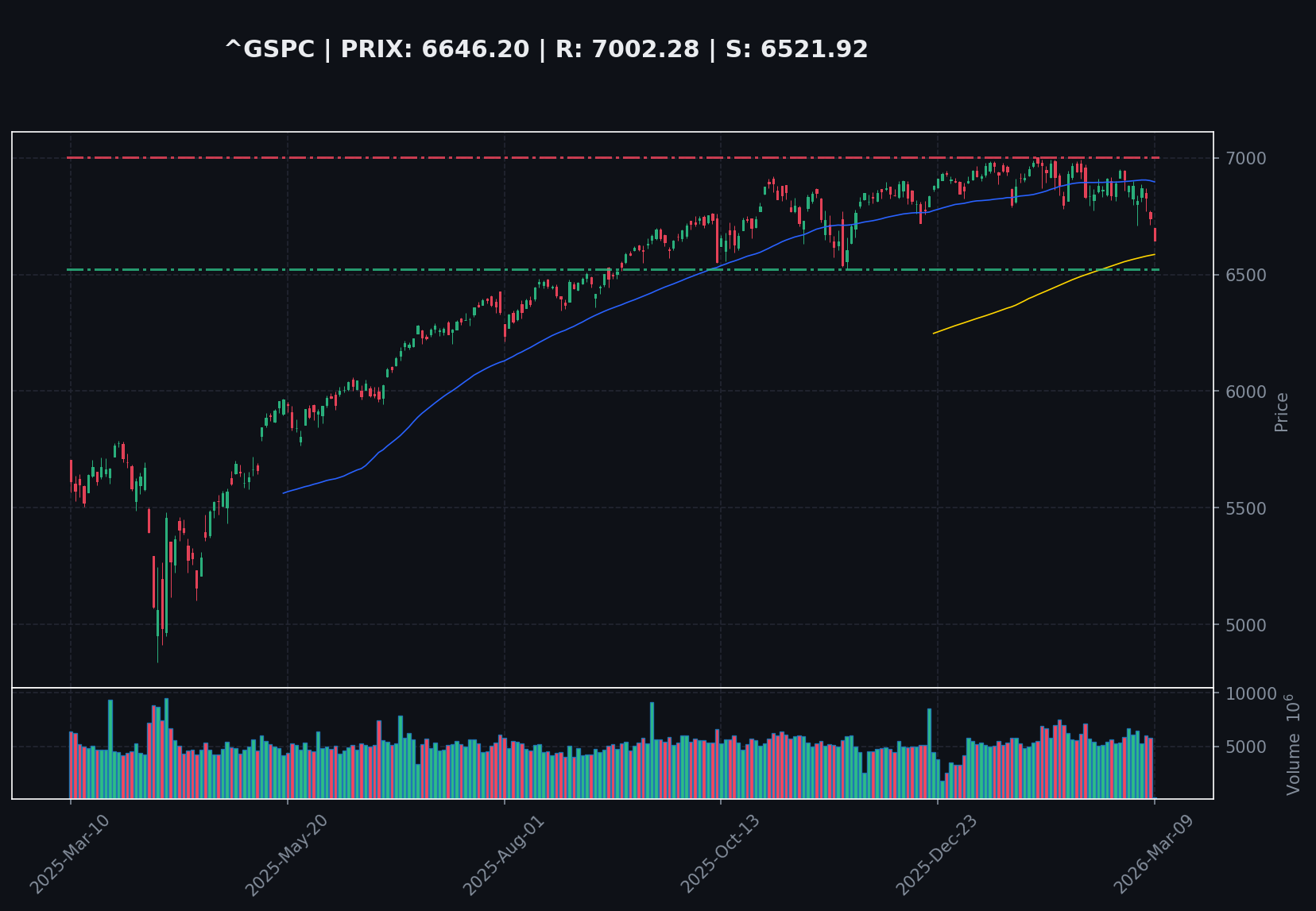 L'indice se situe actuellement à 6651.40$, proche du support à 6648.38$. Le RSI à 36.12 indique une situation de survente potentielle, mais la pression baissière reste présente. Le volume actuel est faible, à 5% de sa moyenne mensuelle, suggérant un manque de conviction acheteuse.