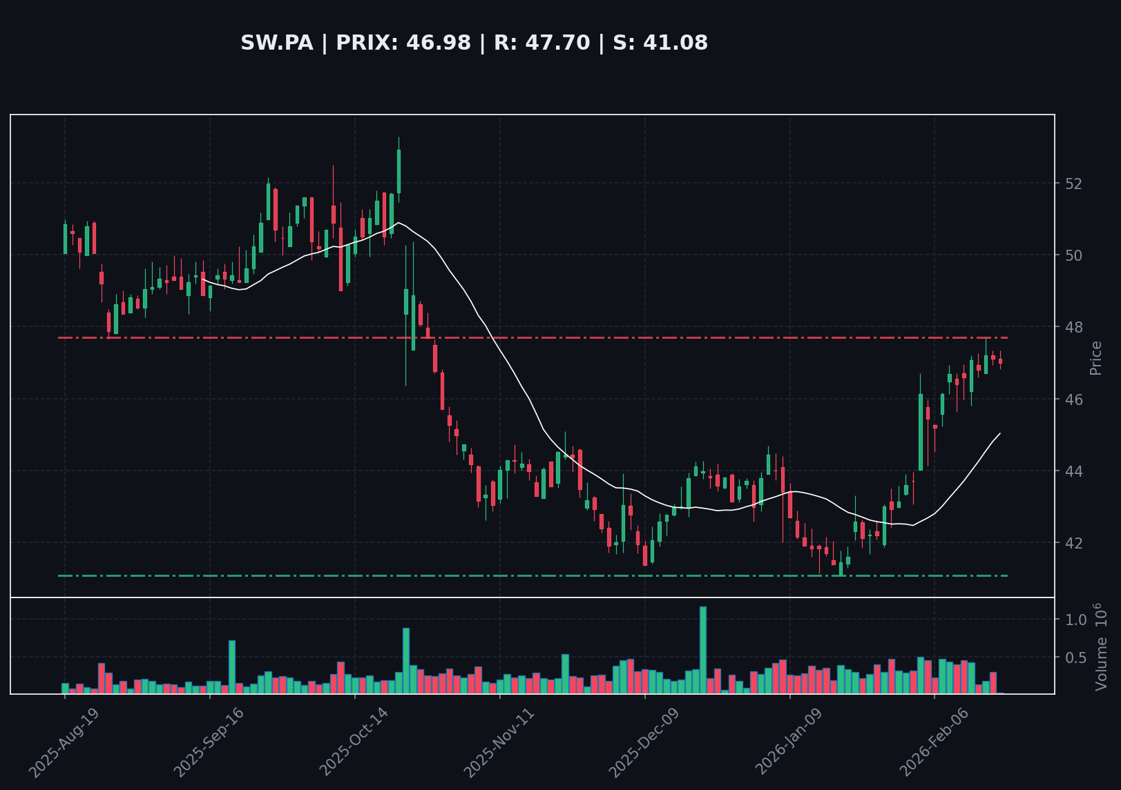 Schneider Electric (SW.PA) se situe actuellement à 46.98, avec un RSI à 67.99 suggérant une possible surachat à court terme. Le titre évolue au-dessus de sa SMA 200 (47.92), indiquant une tendance haussière long terme. La résistance des 30 derniers jours est à 47.70 et le support à 41.08. Si le prix casse la résistance à 47.70, l'objectif suivant serait un retour sur le plus haut annuel. En cas de repli, le support à 41.08 serait un premier niveau de consolidation.