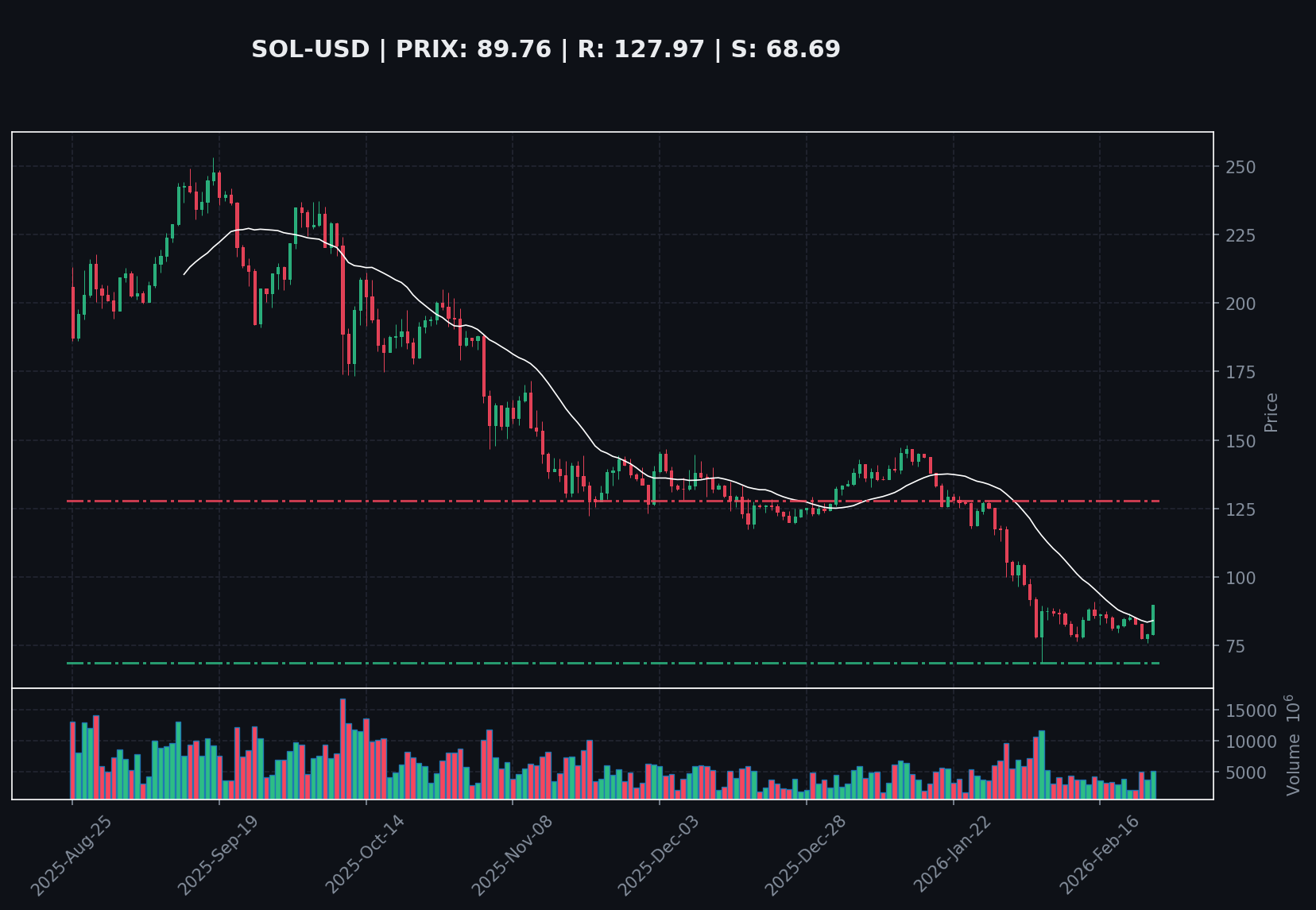 Solana (SOL-USD) se négocie actuellement à 89.76. L'analyse technique montre un RSI neutre, oscillant autour de 48.26, indiquant une absence de momentum fort dans les deux sens. Le prix est bien en dessous de sa moyenne mobile sur 200 jours (SMA 200), qui se situe à 158.97, suggérant une tendance baissière à long terme. Les niveaux de support et de résistance à court terme (30 jours) se situent respectivement à 68.69 et 127.97.