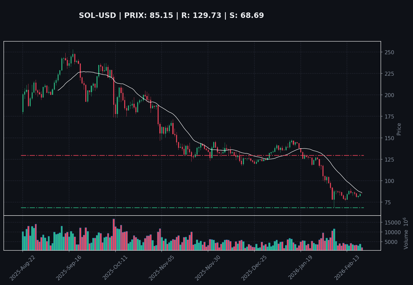 Scénarios: * Si Solana (SOL-USD) casse la résistance à 129.73, alors l'objectif suivant se situe autour de 219, conformément aux prévisions optimistes. * Sinon, un retour vers le support à 68.69 est probable.