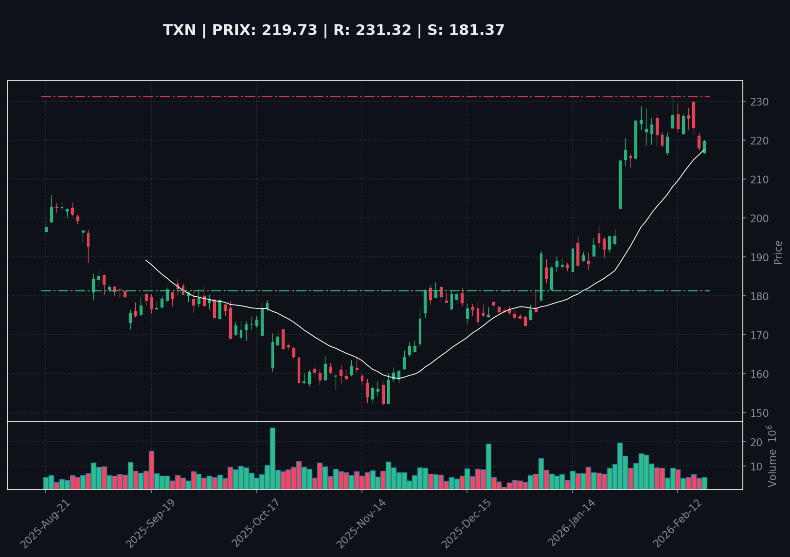 Texas Instruments (TXN) se négocie à 219.73. Le RSI(14) à 59.87 indique un momentum neutre. La SMA(200) se situe à 185.94, confirmant une tendance haussière de long terme.