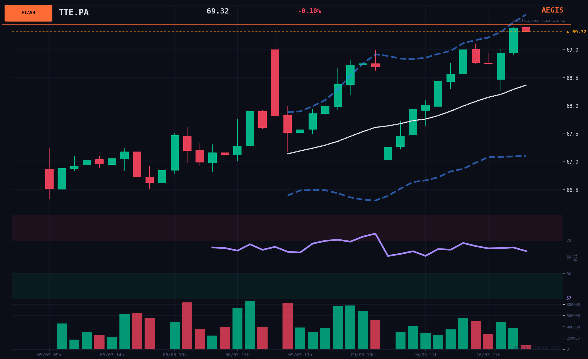 • Scénario Baissier (15%) : Rejet Technique. La faiblesse des volumes se confirme et le titre échoue à progresser. Une aversion au risque globale ou une chute des cours du brut entraîne une prise de bénéfices rapide, ramenant le prix vers le support des 66.79€. Catalyseur : Chute des prix du pétrole, dégradation du sentiment de marché.
