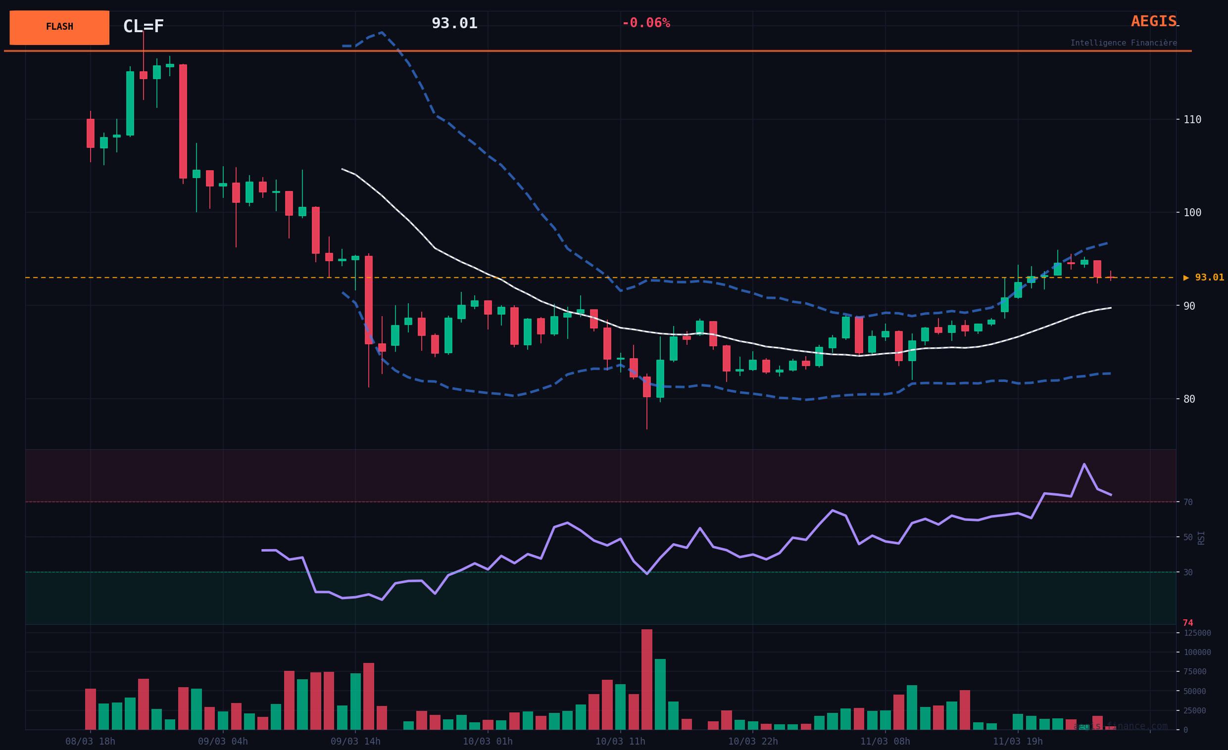 BULLISH Scenario (Prob: 70%): Military escalation continues, leading to tangible supply disruptions (e.g. Strait of Hormuz). The price continues its run towards the psychological barrier of $100, then potentially the resistance of $119.48. Catalysts: New attacks, sanctions, bellicose statements.
