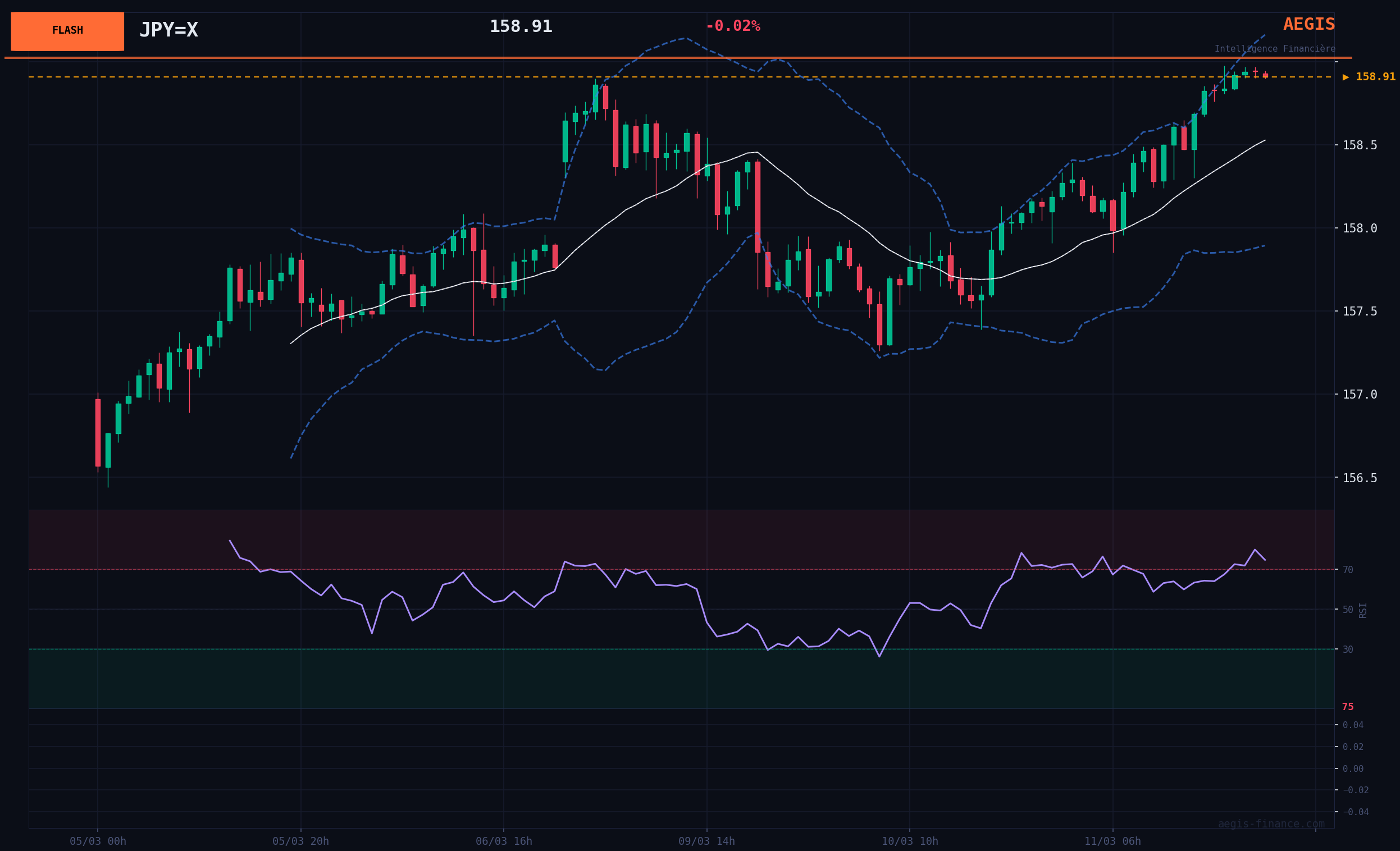 SYNTHESIS OF FLOWS USD/JPY is at maximum tension. On one hand, the abysmal interest rate differential between the United States and Japan continues to fuel the 'carry trade', exerting structural BEARISH pressure on the yen. Recent news flows confirm this fundamental weakness, citing disappointing Japanese growth data. On the other hand, rhetoric surrounding a potential intervention by the Bank of Japan (BOJ) to support its currency intensifies as the pair approaches key psychological levels, creating an explosive situation where technical dynamics confront political risk. STRUCTURE: TECHNICAL AND VOLUMETRIC The dynamic is clearly BULLISH in the short term, with an intraday push of +0.54% bringing the price to 158.90, directly on the major 30-day resistance at 158.98. Volume, at 100% of its average, supports the validity of this attack without signaling capitulation. The RSI at 72.69 indicates an overbought condition, which increases the risk of consolidation or a tactical pullback. However, the price's position well above its moving averages (SMA20 at 155.69, SMA200 at 151.42) confirms a powerful and well-established underlying trend. SCENARIOS & CATALYSTS