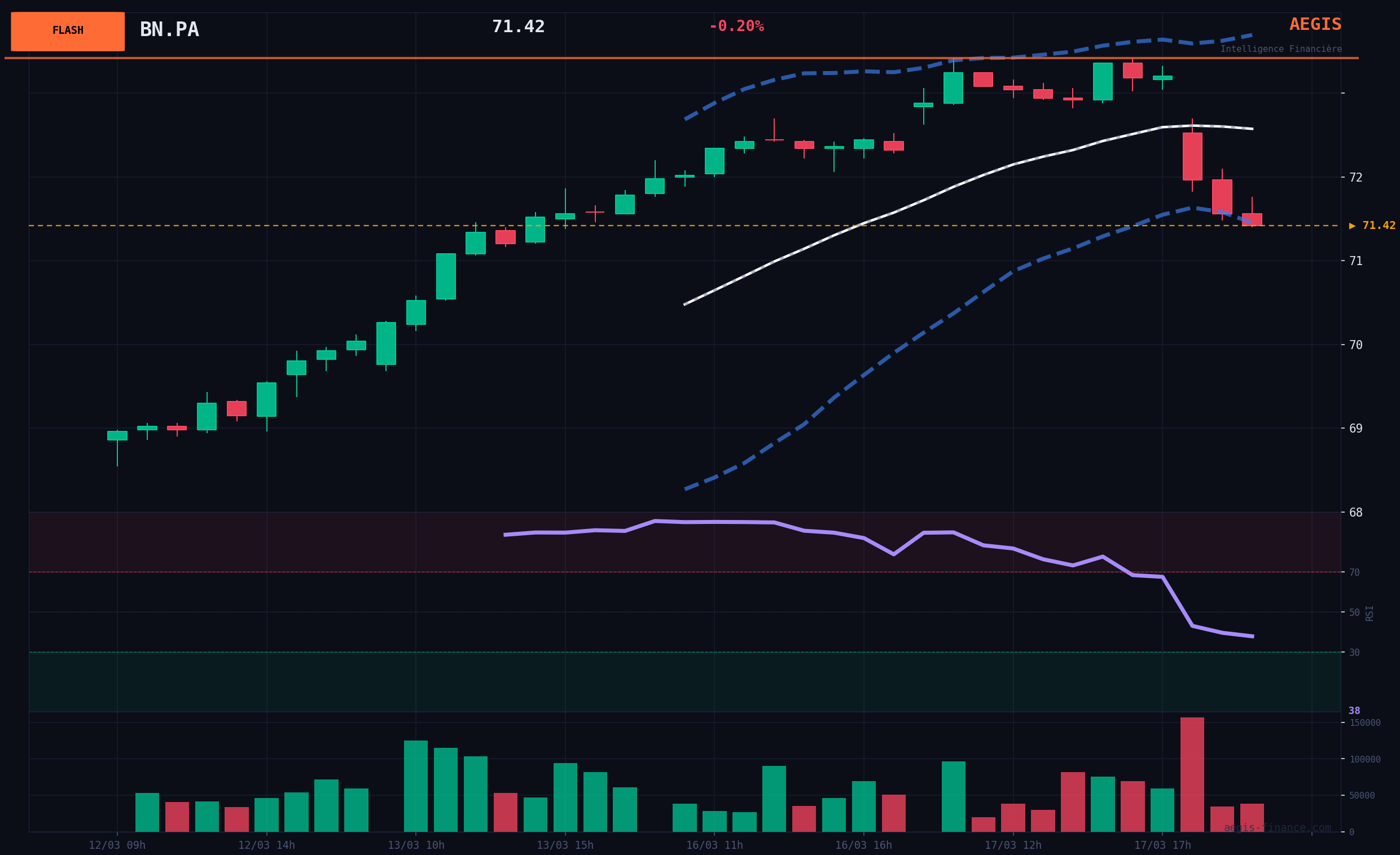 Le titre BN.PA se trouve à un point d'inflexion technique. Après avoir échoué à se maintenir au-dessus de sa moyenne mobile à 200 jours (73.17€), le prix a cassé sa moyenne mobile à 20 jours (71.45€), agissant désormais comme une résistance immédiate. Le prix actuel de 71.40€ se situe dans une zone de vulnérabilité, avec un RSI à 44.61 qui indique un momentum baissier mais non survendu, laissant une marge pour une poursuite de la baisse. Le support majeur à surveiller se situe à 67.48€, tandis que la zone des 74.60€ constitue la résistance supérieure à 30 jours.