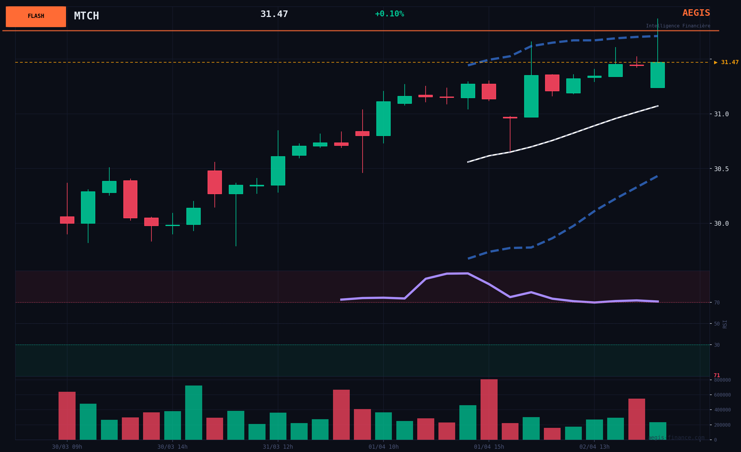 - Scénario de Base (45%) : Consolidation latérale. MTCH devrait évoluer dans un range défini par le support à 29.70$ et la résistance à 32.24$. Le régime de marché en "TRANSITION" sur les indices majeurs, combiné à un score de risque macro-structurel critique (RAS 85/100), limite les mouvements directionnels prononcés. Le faible volume actuel renforce l'idée d'une absence de conviction pour une rupture de range. Catalyseurs : Maintien du VIX au-dessus de 20, absence de catalyseurs micro majeurs, persistance de l'incertitude géopolitique et monétaire.