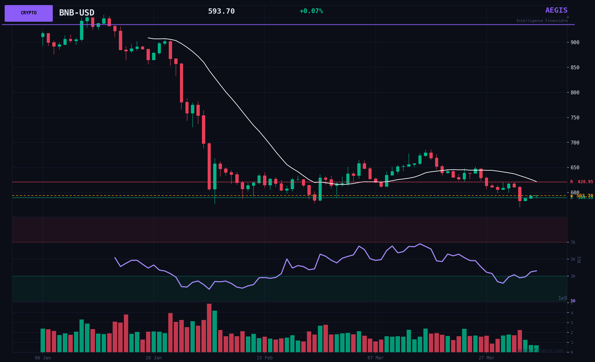 Dans un régime de marché en TRANSITION et un contexte de risque géopolitique critique (RAS 76), ce signal BAISSIER sur BNB-USD est une stratégie de suivi de tendance structurelle, capitalisant sur la faiblesse technique et la pression macroéconomique. Le risque de volatilité reste élevé avec un VIX à 23.87. Le signal se déclenche sur une clôture journalière sous le support de 570 $. Le premier objectif (TP1) est fixé à 520 $ pour une sécurisation partielle. L'objectif final à 3 mois (TP2) est de 450 $. Le stop de protection sera placé au-dessus de la SMA20, à 621.81 $. Sizing recommandé : Position réduite (0.5x).