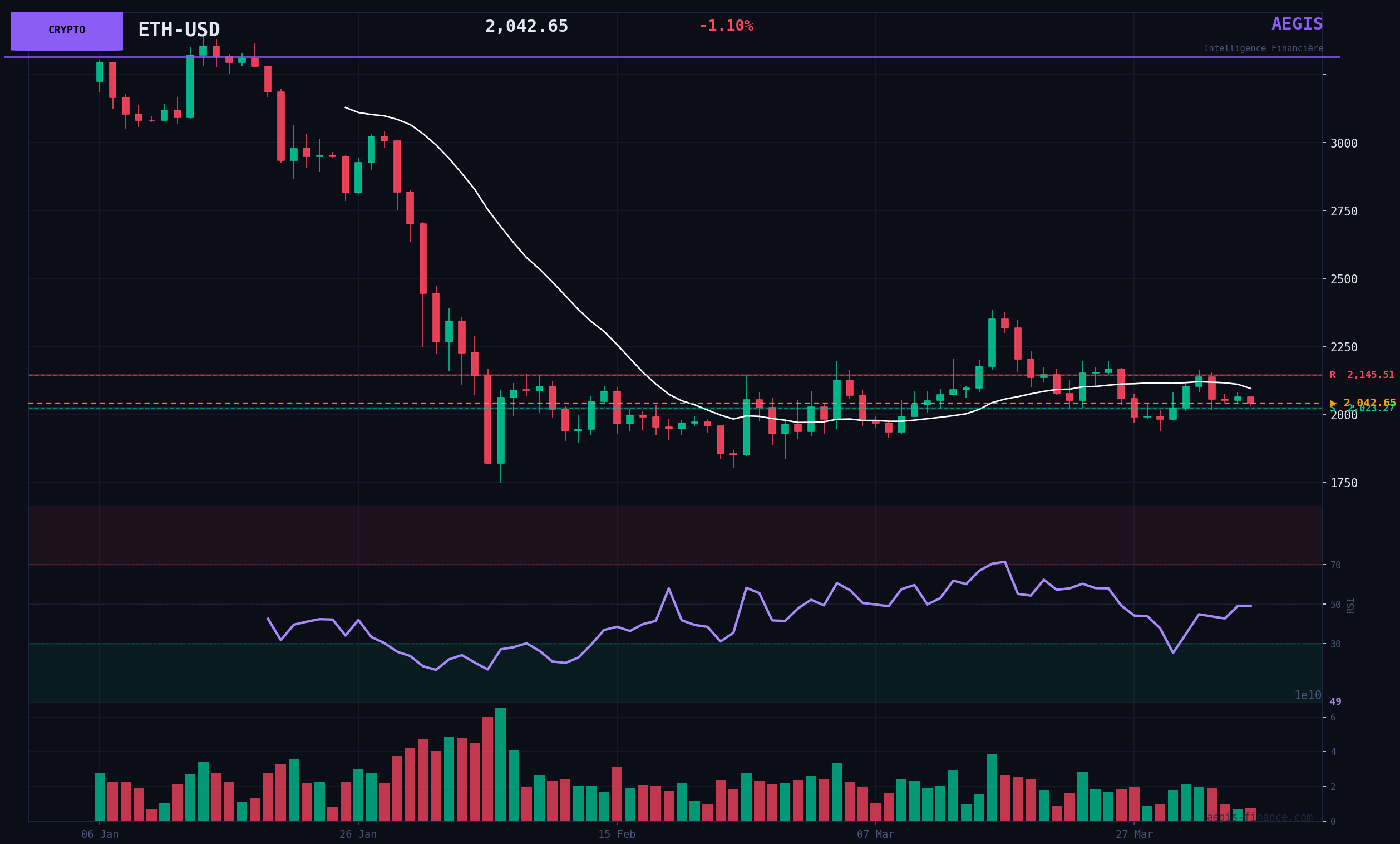 Techniquement, Ethereum évolue dans une structure de fond baissière, comme en témoigne sa position nettement sous sa moyenne mobile à 200 jours (2992$). À court terme, le prix consolide sous sa moyenne mobile à 20 jours (2096$), qui agit comme une première résistance dynamique. Le RSI (14) à 49.10 se situe en zone de neutralité, confirmant l'absence de momentum directionnel. Les volumes de transaction sont faibles, à seulement 44% de la moyenne mensuelle, ce qui caractérise une phase d'indécision et d'attentisme du marché. Le range pertinent à surveiller est délimité par le support mensuel à 1915$ et la résistance mensuelle à 2384$.
